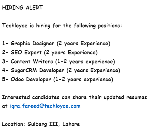 Interested candidates can share their updated resumes at iqra.fareed@techloyce.com